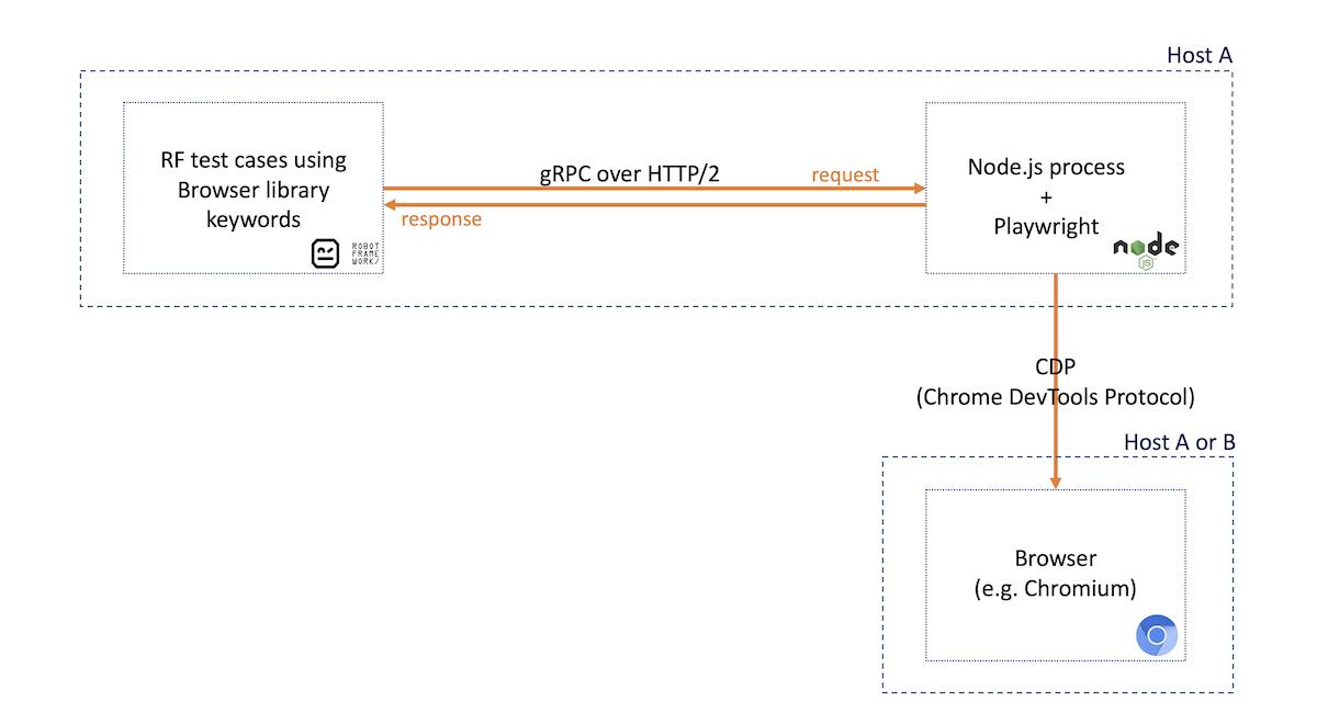 This architecture may seem a bit cumbersome but there's a reason behind it. When Browser library project was started, there wasn't any Python library available for Playwright. The team decided to make a gRPC wrapper that would interact with a Node.js process where the official JavaScript "playwright" package would be running.